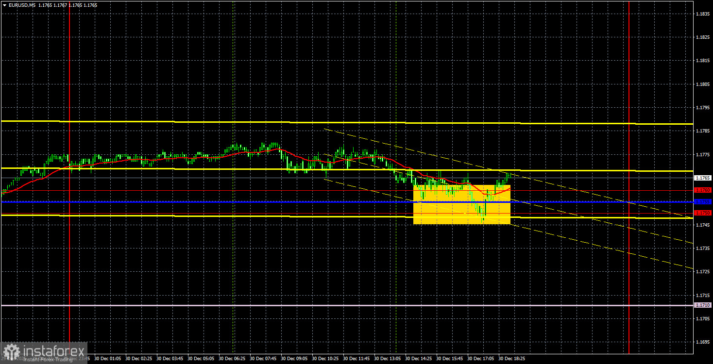 На 5-минутном ТФ во вторник был сформирован один торговый сигнал, но о его качестве можете судить сами. Цена отскочила от области 1,1750-1,1760 только для того, чтобы не пройти вверх ни одного пункта. Формально никакого отскока и не было. Может быть, он случится сегодня, но даже на 20-30 пунктов движения в нужном направлении рассчитывать сейчас довольно тяжело.